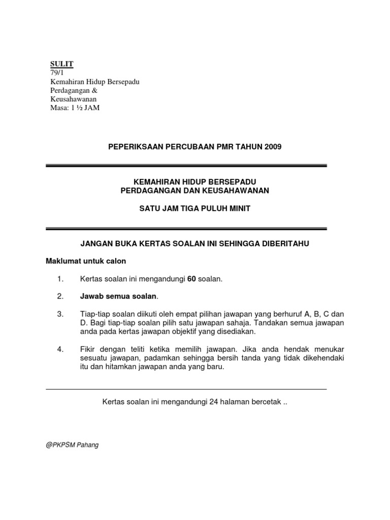 Pmr Percubaan 2009 Pahang Kemahiran Hidup Kt