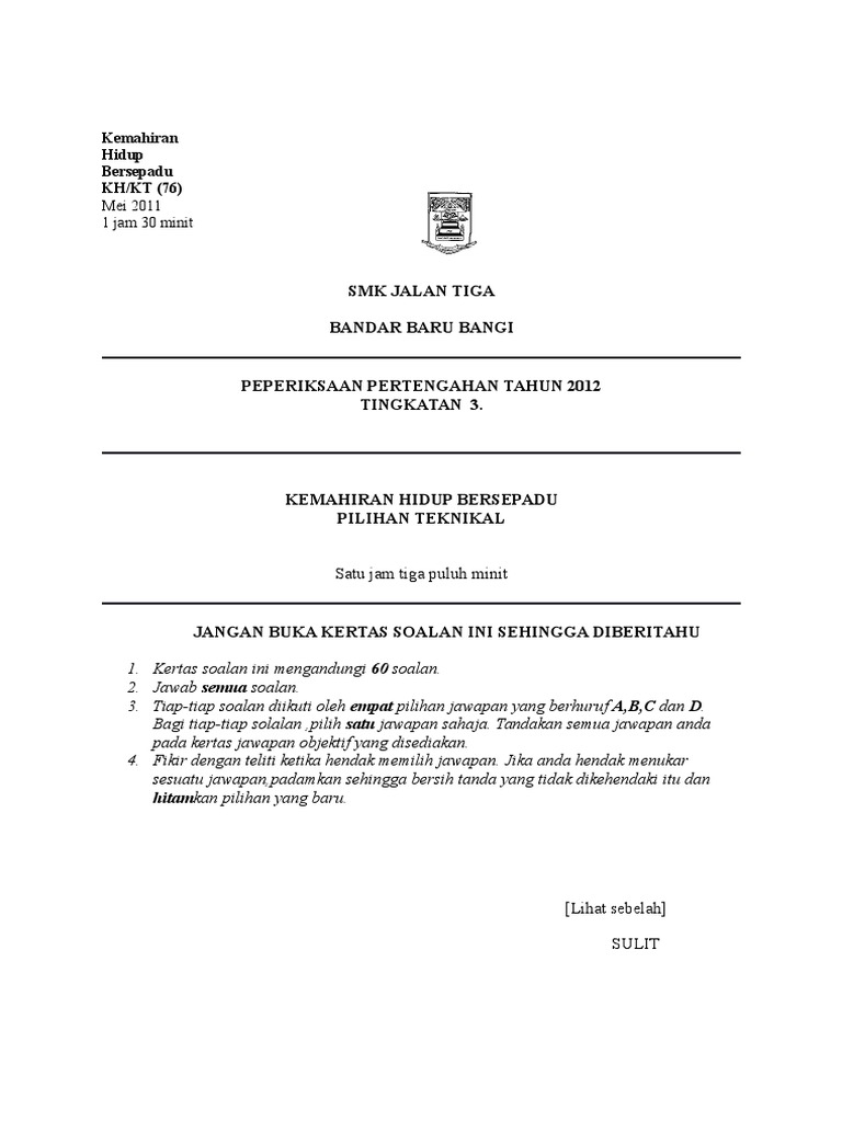 Smk Jalan Tiga Bandar Baru Bangi Kemahiran Hidup Bersepadu Kh Kt 76