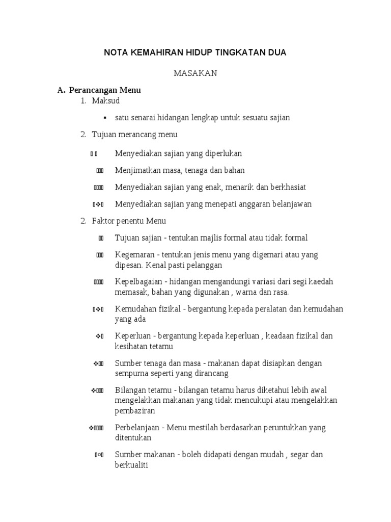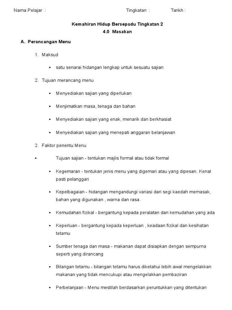 Nota Kemahiran Hidup Tingkatan Dua Masakan A Perancangan Menu 1