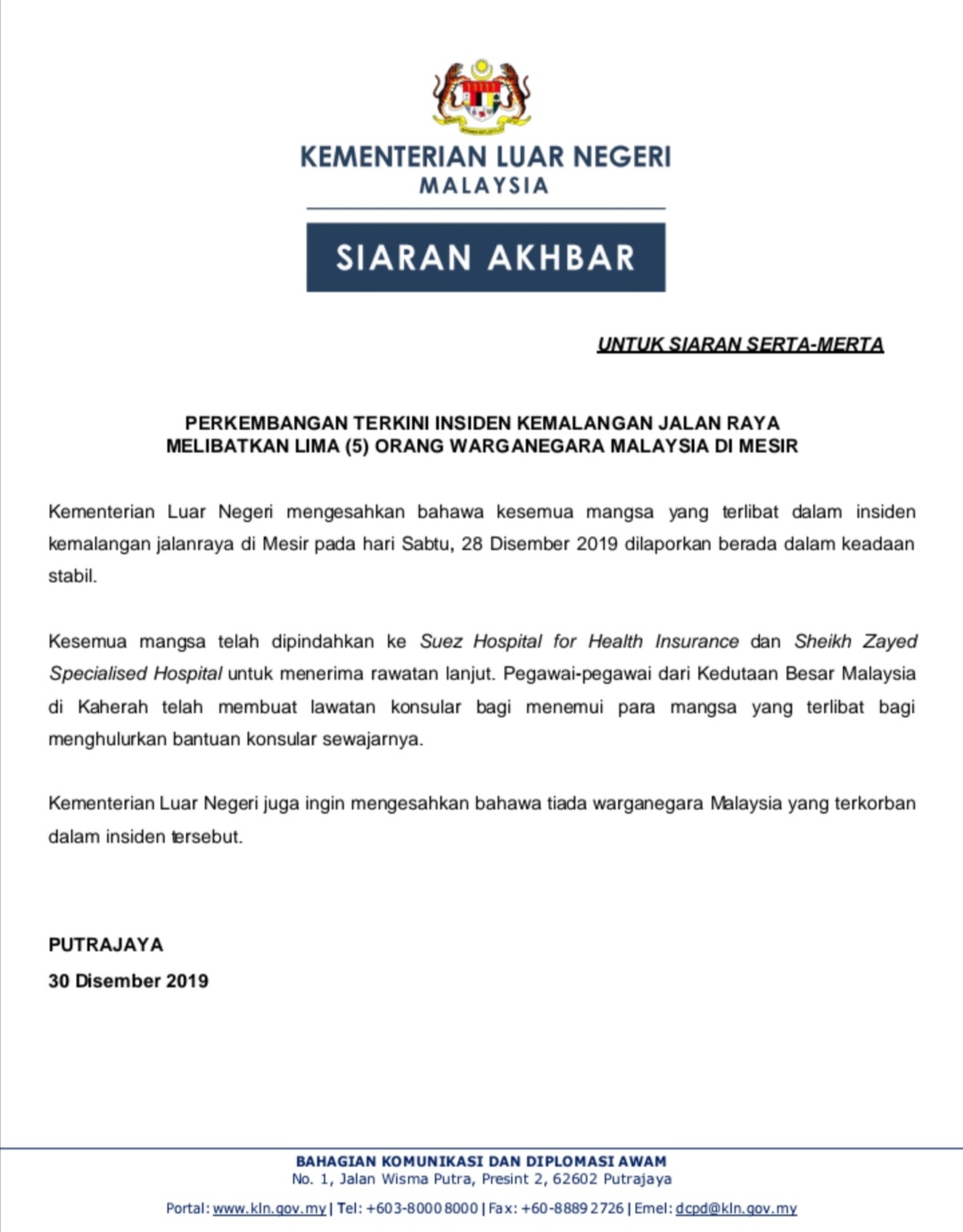 Wisma Putra On Twitter Latest Update On The Road Accident In Egypt Involving 5 Malaysians All 5 Victims Are In Stable Condition Wisma Putra Also Confirms That There Were No Casualties Involving