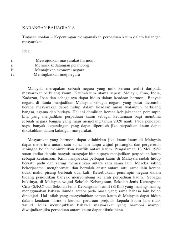 Kepentingan Mengamalkan Perpaduan Kaum Dalam Kalangan Masyarakat Contoh Karangan Spm