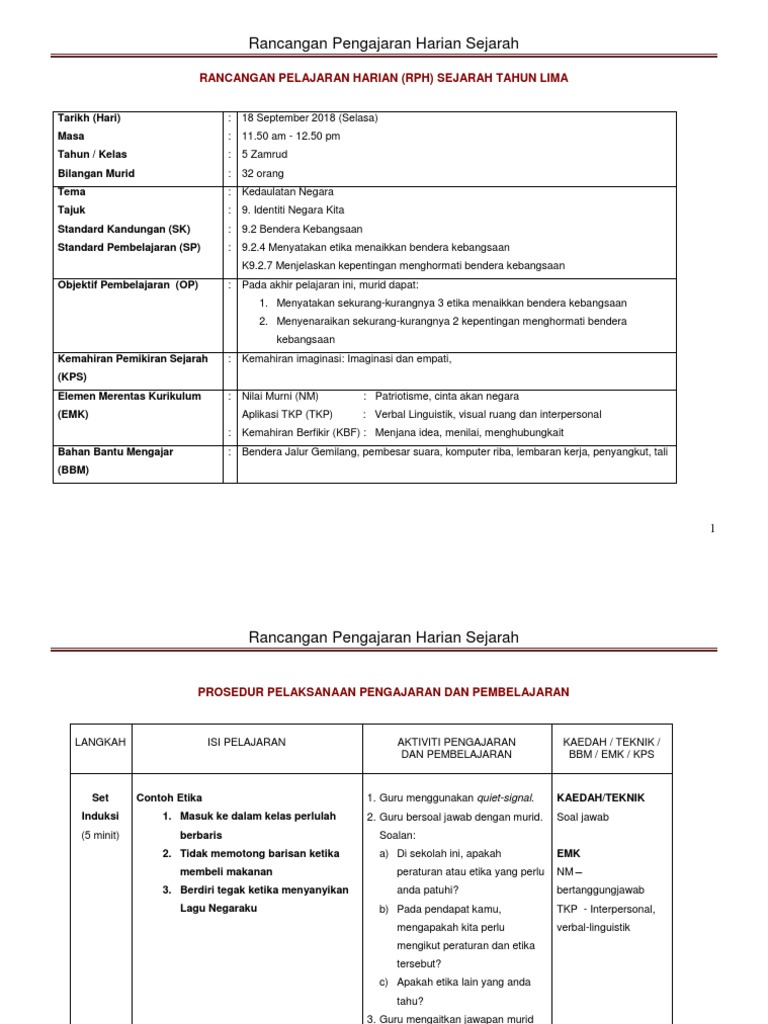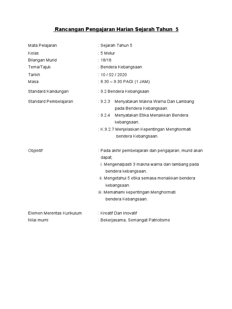 Rancangan Pengajaran Harian Sejarah Mata Pelajaran Dan Kelas Tema Tajuk Tarikh Hari Masa Bilangan Murid Standard Kandungan Standard Pembelajaran