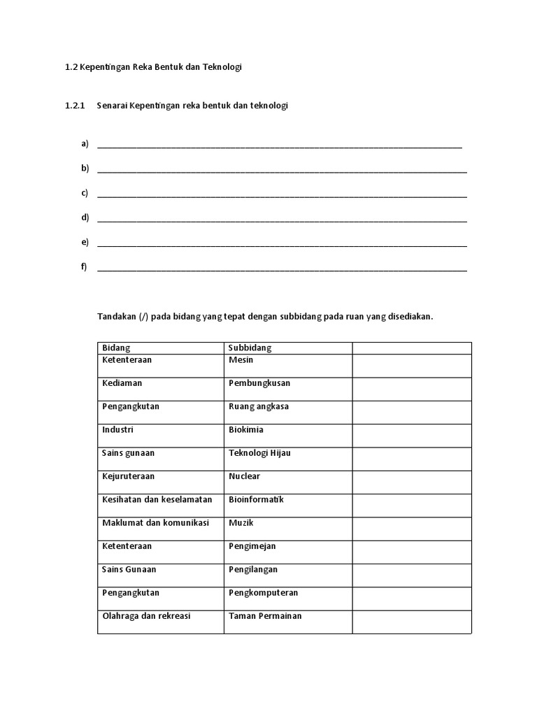 Kepentingan reka bentuk dan teknologi dalam bidang kejuruteraan. Lukisan teknik adalah satu cara untuk berkomunikasi secara bahasa grafik samada dalam persekitaran harian dan juga dalam bidang kejuruteraan. كجوروترأن ialah salah satu aplikasi sains untuk memenuhi keperluan dan kehendak manusia kejuruteraan menggabungkan pengetahuan matematik dan pengalaman untuk mereka bentuk sesuatu objek atau proses. Untuk membolehkan pelajar mahir dalam menyelesaikan masalah bidang teknologi kejuruteraan rekabentuk produk secara inovatif kreatif dan beretika melalui pendekatan yang mapan untuk mewujudkan pelajar yang berkemahiran keusahawanan dan menyedari keperluan pembelajaran sepanjang hayat untuk pembangunan kerjaya yang berjaya. Kepentingan reka bentuk dan teknologi tujuan utama reka bentuk adalah untuk dijadikan asas dalam penghasilan produk sebenar yang bermanfaat untuk kehidupan manusia.