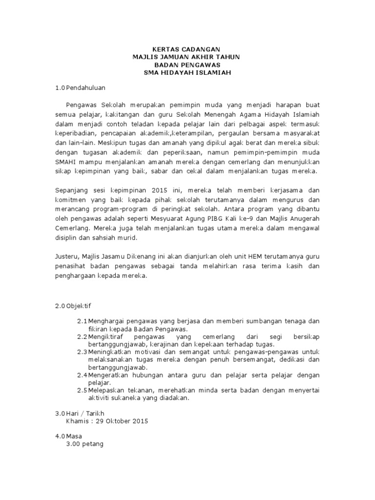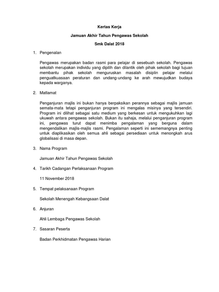Kertas kerja jamuan akhir tahun pengawas. Tujuan majlis ini diadakan di lokasi pilihan ini ialah untuk aktiviti makan makan dan aktiviti sukaneka. Kertas kerja jamuan akhir tahun badan pengawas dan displin. 1 0 pendahuluan program jamuan akhir tahun untuk pengawas pengawas sk tanah rata merupakan salah satu acara tahunan. Contoh kertas kerja jamuan akhir tahun contoh kertas kerja jamuan hari guru contoh kertas kerja projek contoh kertas kerja gotong royong contoh kertas kerja perniagaan contoh kertas kerja hari keluarga contoh kertas kerja program contoh kertas cadangan contoh kertas kerja lawatan contoh kertas rancangan perniagaan.