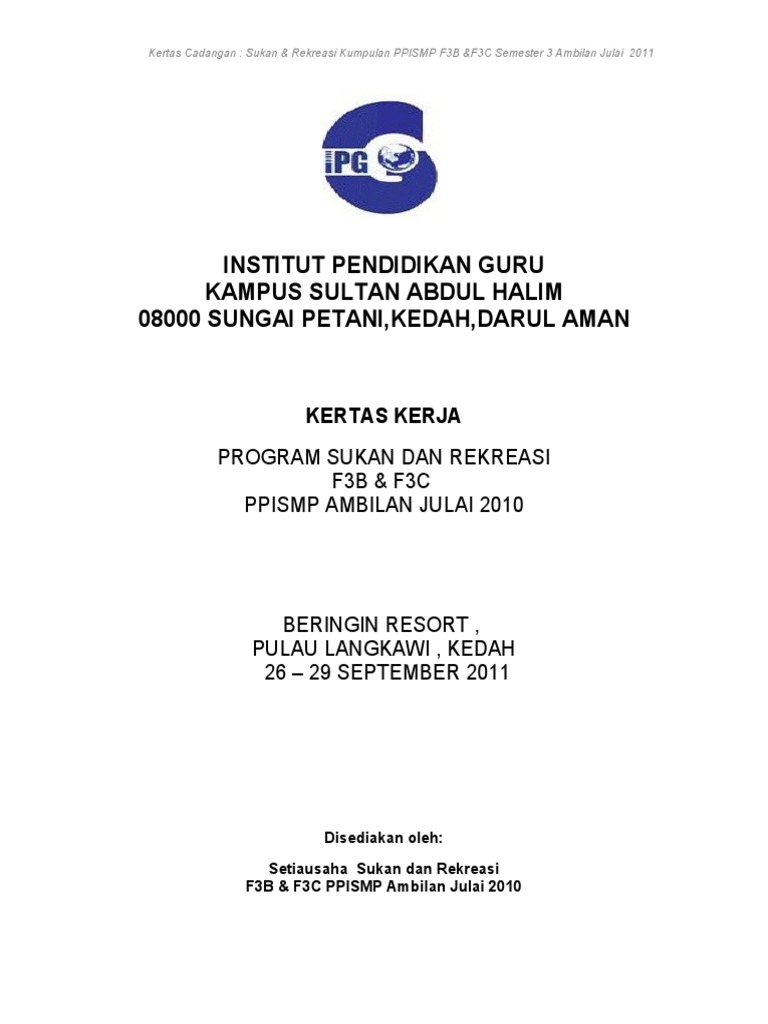 Kertas Cadangan Sukan Rekreasi Kumpulan Ppismp F3b F3c Semester 3 Ambilan Julai 2011