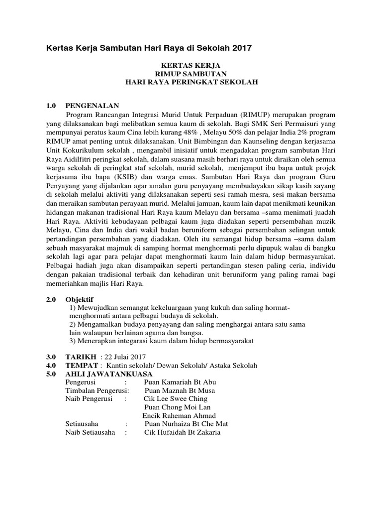 Kertas kerja sambutan hari raya peringkat sekolah. Unit kokurikulum sekolah dengan kerjasama ketua panitia dunia sejarah pendidikan seni visual panitia pendidikan muzik serta panitia pendidikan moral negaraku sehatisejiwa. Kertas kerja rimup sambutan hari raya peringkat sekolah 2016 1 0 pengenalan program rancangan integrasi murid untuk perpaduan rimup merupakan program yang dilaksanakan bagi melibatkan semua kaum di sekolah. Peringkat sekolah tarikh hari aktiviti perincian catatan 14 8 2018 selasa pelancaran bulan. Mewarna bunga raya prasek tahun 2 3 mewarna poster merdeka 15 ogos 2017 selasa 2.