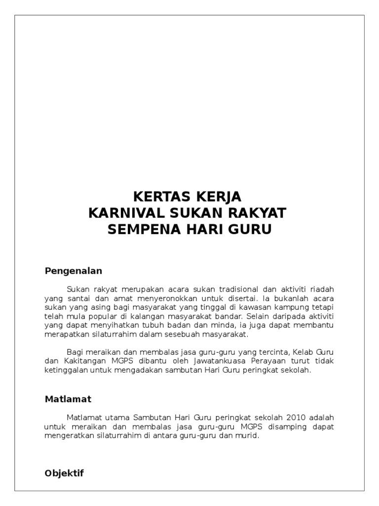 8 00 pagi 1 00 petang. Academia edu is a platform for academics to share research papers. Kertas kerja sukan rakyat mohon dana 1. Kertas kerja penganjuran karnival sukan rakyat 2011peringkat felda bukit rokan utarapengenalanpihak felda melalui pengurus encik abdul jalal ajat telah meminta kerjasama pihak jkkkuntuk menganjurkan satu karnival sukan di peringkat felda bukit rokan utara.