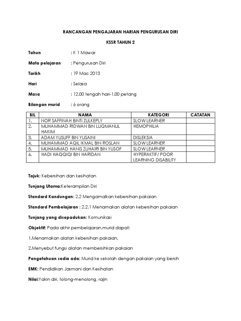 Rancangan Pengajaran Harian Pengurusan Diri