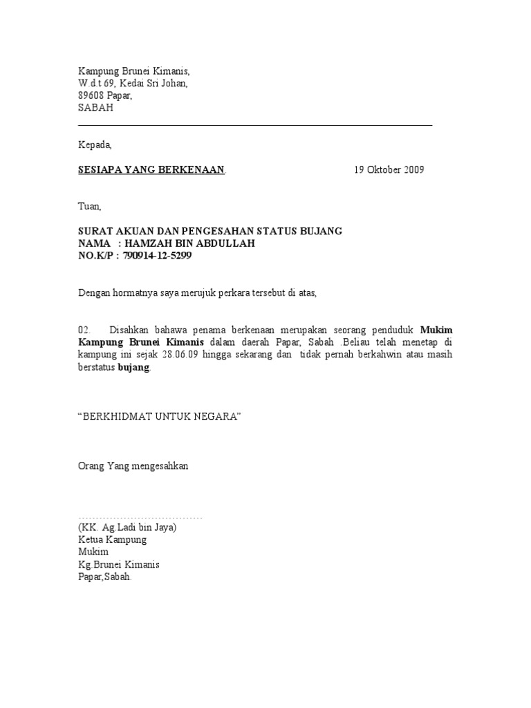 Contoh Surat Pengesahan Bujang Dari Ketua Kampung
