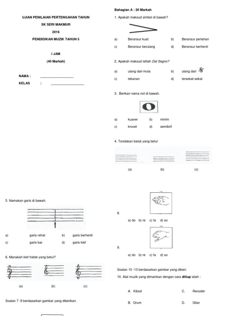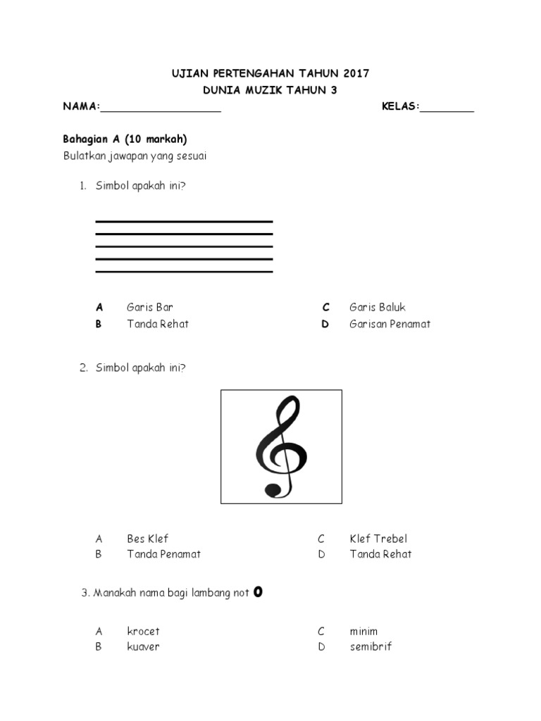 Ujian Pertengahan Tahun 2017 Dunia Muzik Tahun 3 Nama Kelas Bahagian A 10 Markah