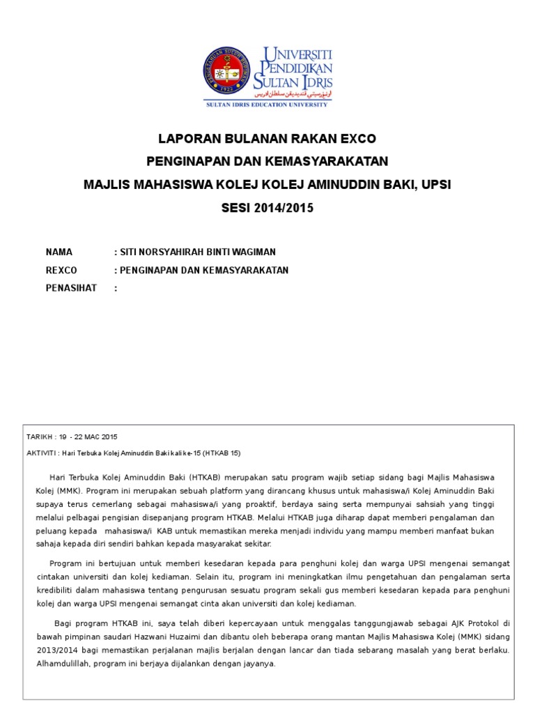 Laporan Bulanan Rakan Exco Penginapan Dan Kemasyarakatan Majlis Mahasiswa Kolej Kolej Aminuddin Baki Upsi Sesi 2014 2015
