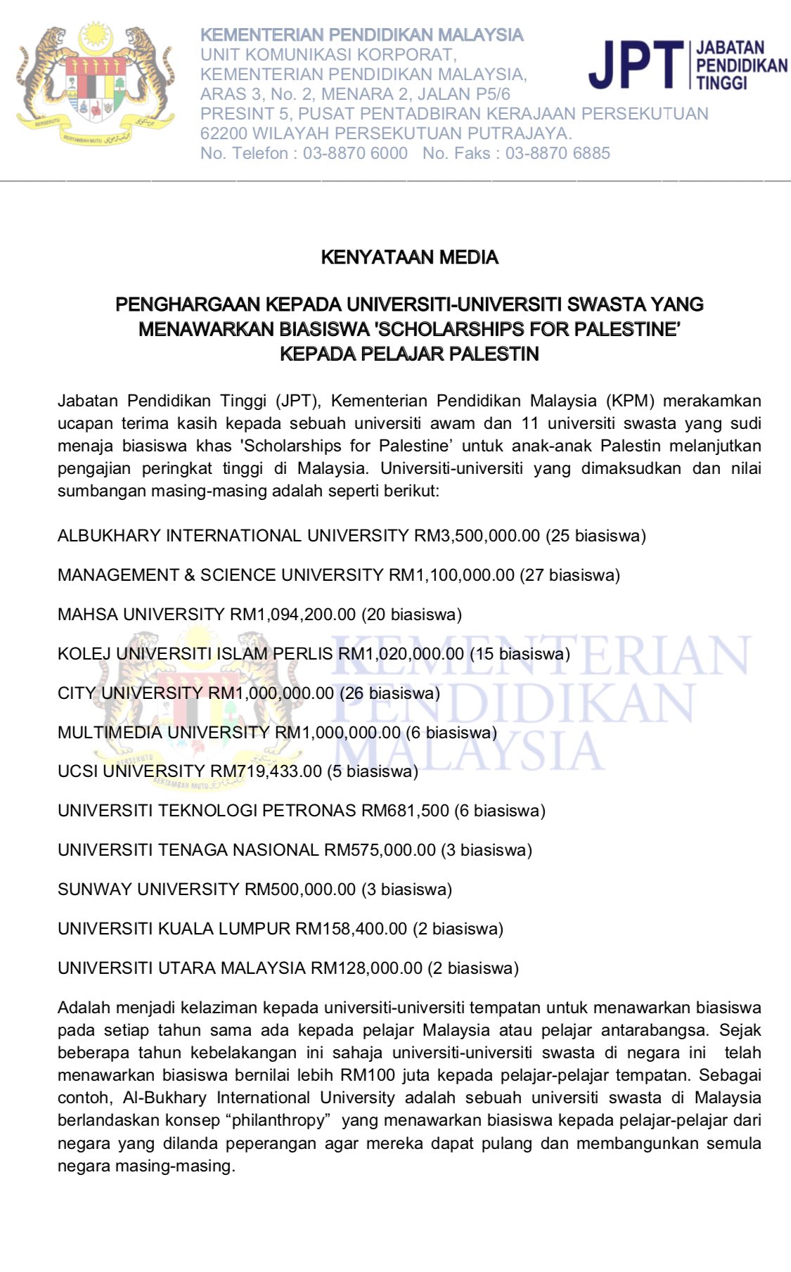 Syahredzan Johan On Twitter Jabatan Pengajian Tinggi Has Confirmed That The Scholarships For Palestinians Are Privately Funded And Has Provides Details Of The Scholarships In This Press Release Https T Co Lmxlphprkz Https T Co Bcwkxpqc6s