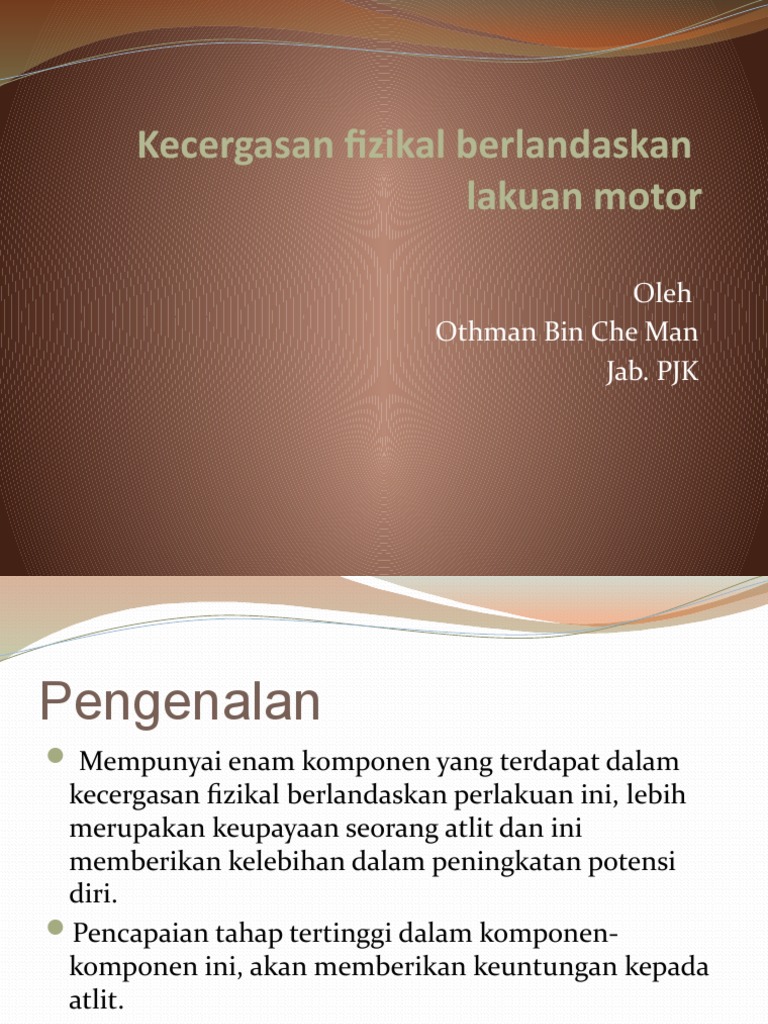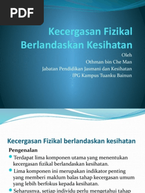 Kecergasan fizikal berlandasakan kesihatan terdapat lima iaitu. Terdapat lima komponen utama yang menentukan kecergasan fizikal berlandaskan kesihatan. Komponen kecergasan fizikal berlandaskan kesihatan 1 daya tahan kardiovaskular kecekapan jantung dan sistem perdaran darah berfungsi dengan sistem respiratori untuk memenuhi keperluan oksijen dalam tubuh badan supaya kerja untuk jangka masa yang panjang dapat diteruskan. Kecergasan fizikal berlandaskan kesihatan konsep kesihatan pada asalnya konsep kesihatan bermakna dalam keadaan sihat dan selamat bebas daripada kecederaan kecacatan dan penyakit.