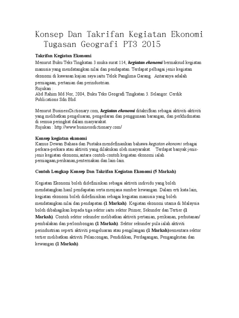 Konsep dan takrifan kegiatan ekonomi pelancongan. Kegiatan ekonomi yang berpotensi dimajukan dan alasan kaedah kajian mendengar taklimat dan penerangan daripada guru geografi pada masa yang sama membuat. Contoh lengkap konsep dan takrifan kegiatan ekonomi 5 markah kegiatan ekonomi boleh didefinisikan sebagai aktiviti individu yang boleh mendatangkan hasil pendapatan serta menjana sumber kewangan. Takrifan dan konsep kegiatan ekonomi. Konsep dan takrifan kegiatan ekonomi geograf pt3 2015.
