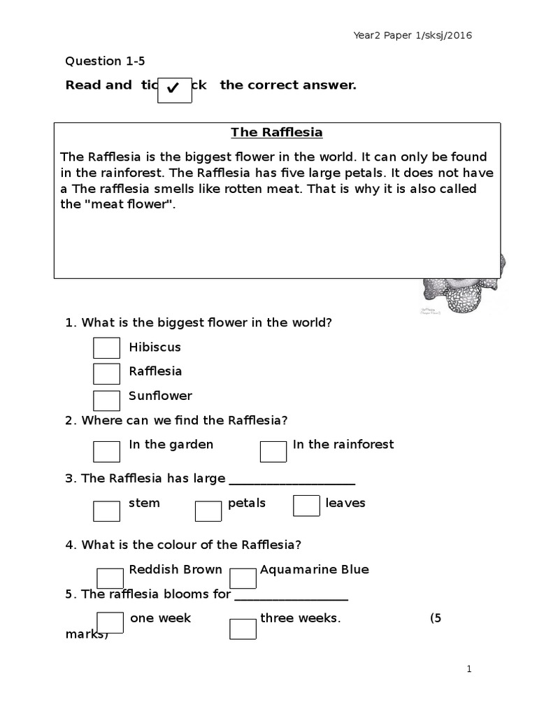 Read And Tick Tick The Correct Answer Year2 Paper 1 Sksj 2016 Flowers Botany