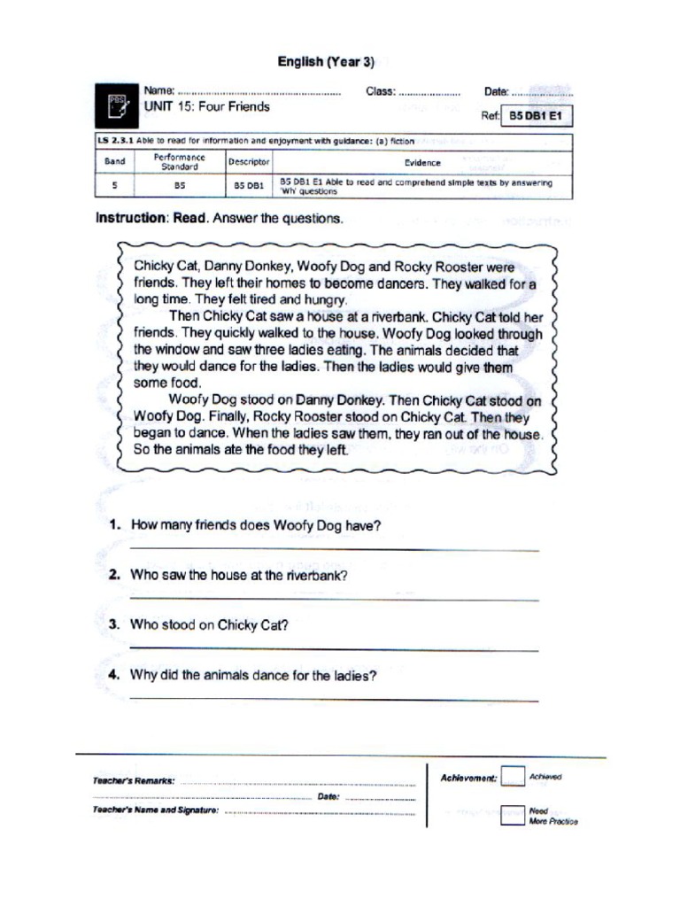 Year 3 Monthly Test 1 Kssr Unit 1 Unit 3 English Language Test Reading Comprehension Skills English Exam