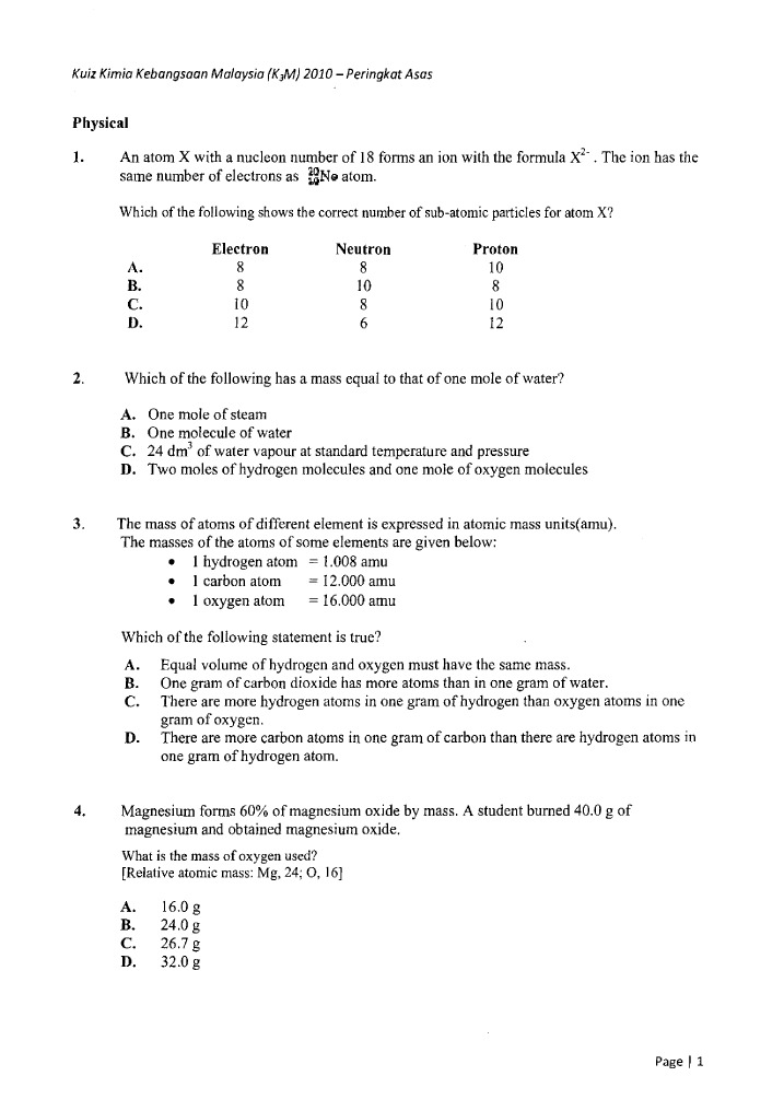 Kuiz Kimia Kebangsaan Malaysia 2010 Peringkat Asas Pdf Document