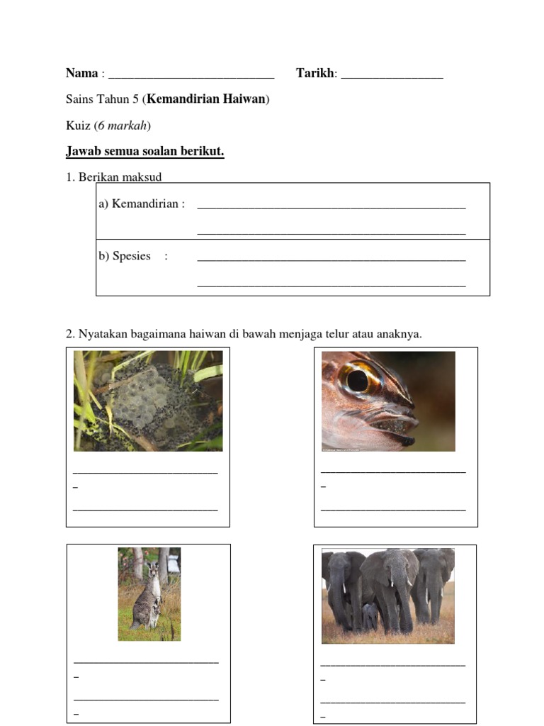 Sains Tahun 5 Kuiz Kemandirian Haiwan 1