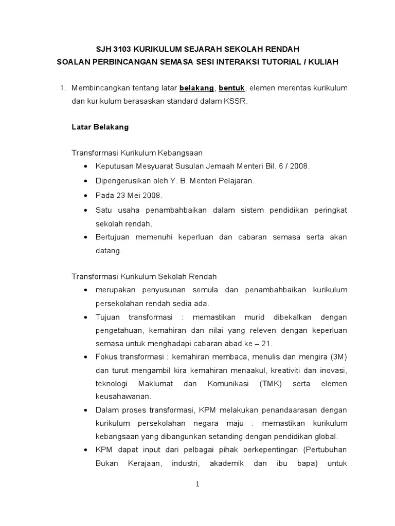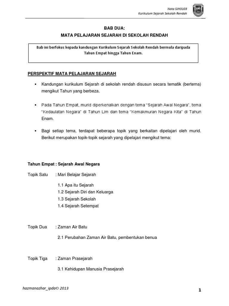 Nota Ringkas Sjh 3103 Kurikulum Sejarah Sekolah Rendah Docx