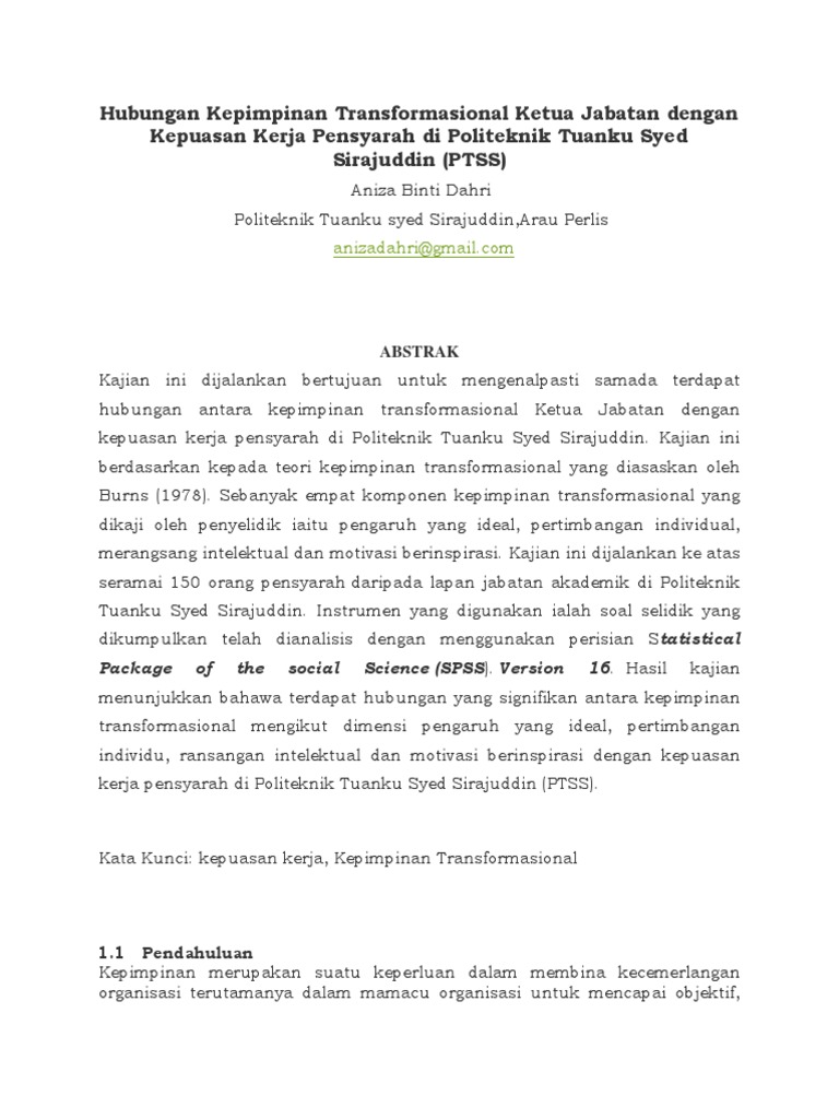Hubungan Kepimpinan Transformasional Ketua Jabatan Dengan Kepuasan Kerja Pensyarah Di Politeknik Tuanku Syed Sirajuddin