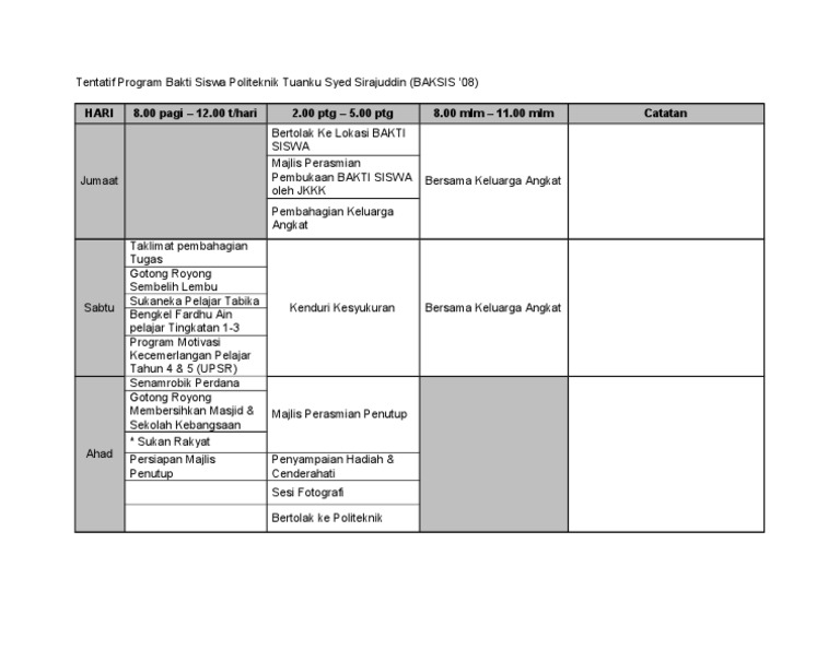 Tentatif Program Bakti Siswa Politeknik Tuanku Syed Sirajuddin