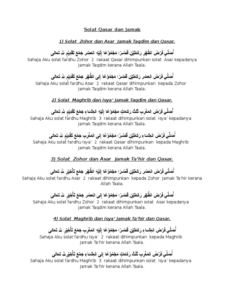 Bacaan niat shalat jamak qashar taqdim takhir dhuhur ashar maghrib isya sholat jamak qoshor merupakan sholat fardhu yang dalam melaksanakannya bisa disatukan di satu waktu misalnya pada jamak takdim ashar ke dzuhur kita bisa melaksanakan sholat ashar pada waktu dzuhur dengan niat sholat jamak takdim sebaliknya kita melaksanakan sholat dzuhur pada waktu ashar berarti kita sholat jamak. Sahaja aku solat fardhu zohor 4 rakaat dihimpunkan solat asar kepadanya jamak taqdim kerana allah taala. Dari sudut bahasa jamak adalah perkataan arab yang bermaksud menghimpunkan atau mengumpulkan sesuatu yang berselerak atau mengarang kitab atau menyusun huruf. Lafaz niat solat jamak qasar a.