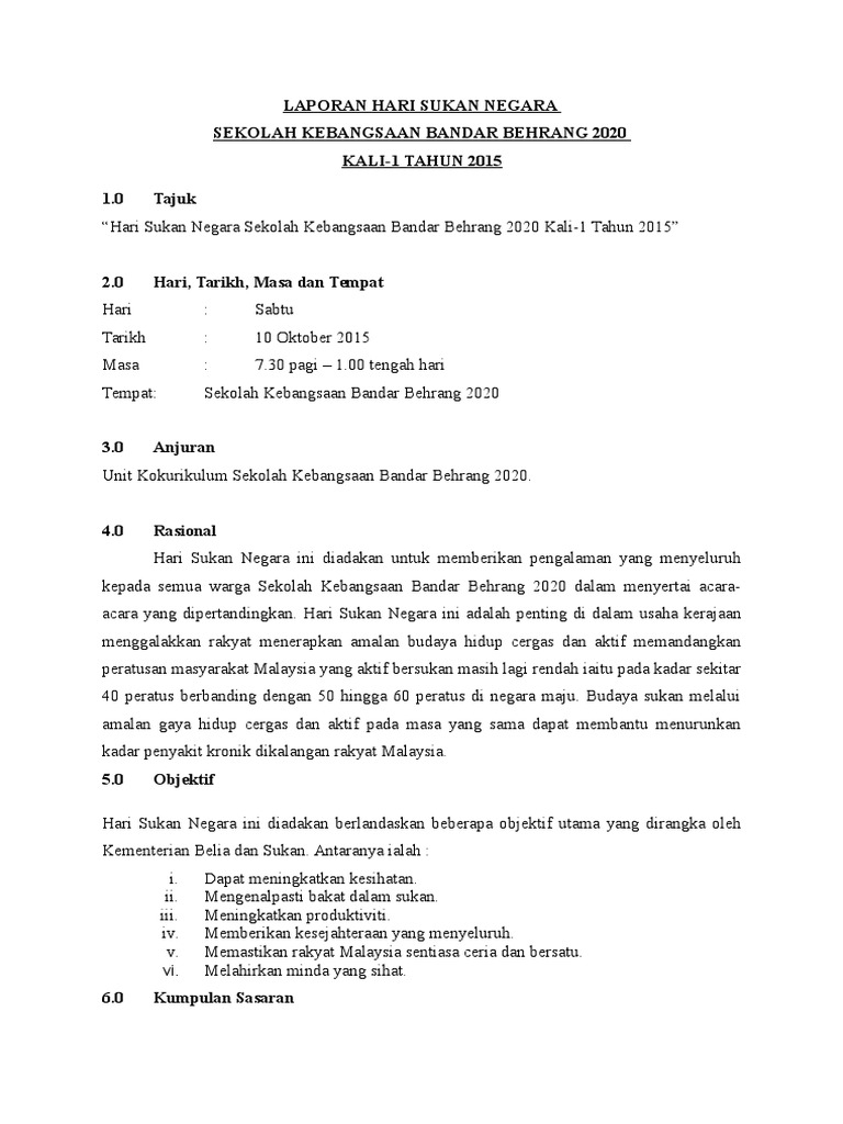 Laporan hari sukan negara. Laporan hari sukan negara. Portal rasmi bulan sukan negara dibangunkan oleh unit pengurusan korporat dan portal bpm kbs. Laporan hari sukan di kolej vokasional kuala krai pada cuti penggal kedua yang lalu kolej vokasional kuala krai telah mengadakan hari sukan. 8 oktober 2016 1 0 pengenalan pada 8 oktober 2016 sk skarok telah mengadakan hari sukan negara peringkat sekolah bertempat di padang sk skarok.