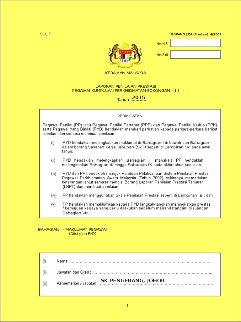 Kerajaan Malaysia Laporan Penilaian Borang J P A Lnpk 2 2009 Kerajaan Malaysia Laporan Penilaian Prestasi Khas Bagi Pegawai Kumpulan Pengurusan Dan Profesional Kumpulan Sokongan Pdf Document