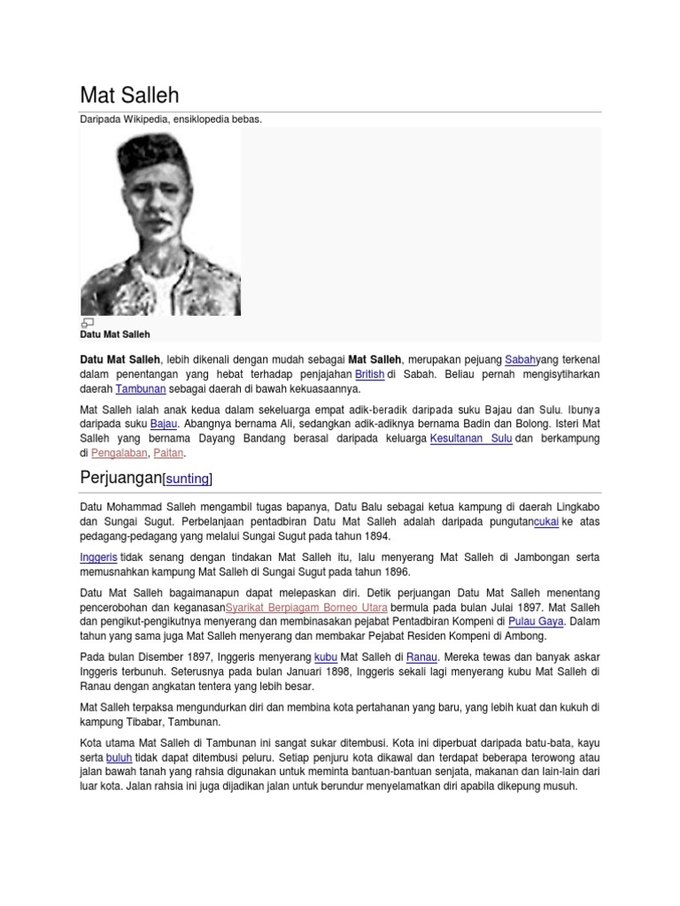 Datu mat salleh lebih dikenali dengan mudah sebagai mat salleh. Antara latar belakang pejuang pejuang di sabah mat salleh mat salleh atau nama sebenarnya datu mat salleh merupakan pejuang sabah yang terkenal dalam memberi tentangan yang hebat kepada penjajahan inggeris di sabah. Mat salleh ialah anak kedua dalam sekeluarga empat adik beradik daripada suku βajau dan ѕulu. Unknown 30 november 2019 6 55 pg mat salleh bukanlah pejuang keamanan di sabah atau pun borneo utara pada masa itu.
