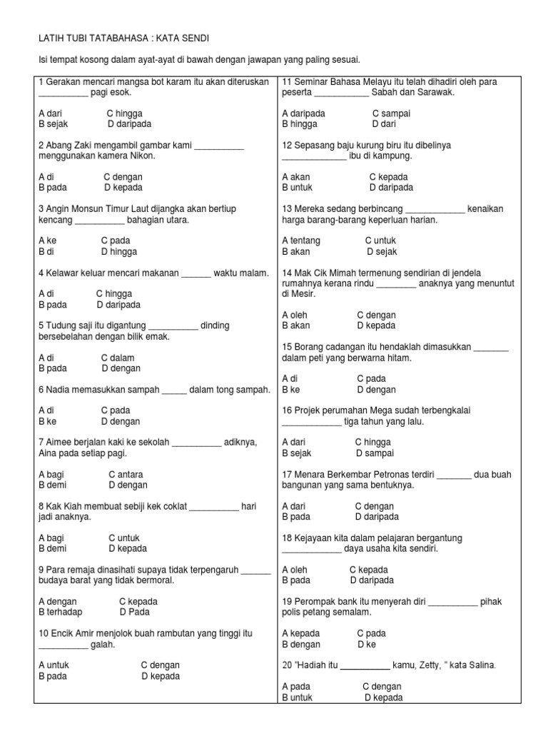 90 Soalan Latih Tubi Kata Sendi Nama Berserta Jawapan