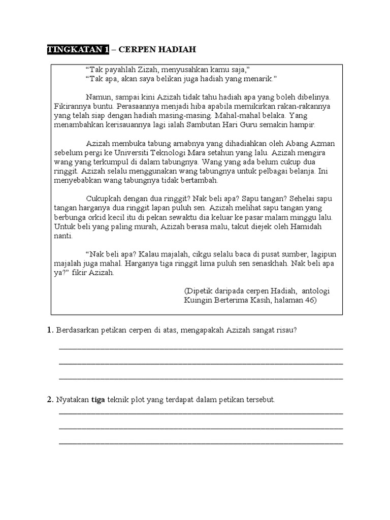 Tingkatan 1 Bahasa Melayu Komsas Cerpen Hadiah Youtube
