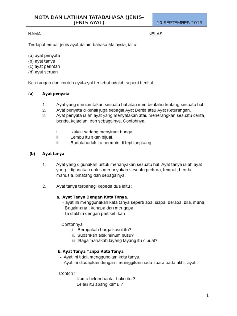 Nota Dan Latihan Tatabahasa Jenis Jenis Ayat Docx