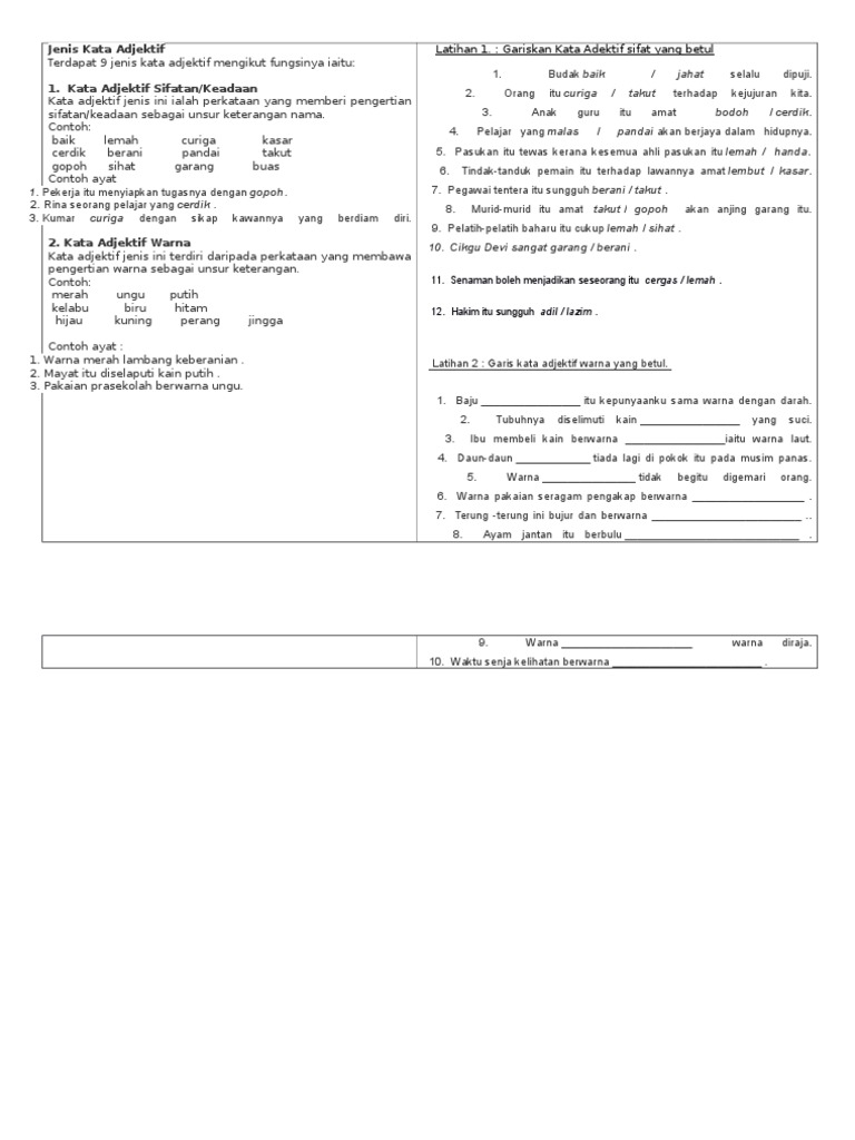 Kata adjektif ialah kata yang menjadi inti dalam frasa adjektif. Kata adjektif modul latih tubi tatabahasa. Latihan 1 latihan 2 latihan 3. Ada sembilan jenis kata adjektif.