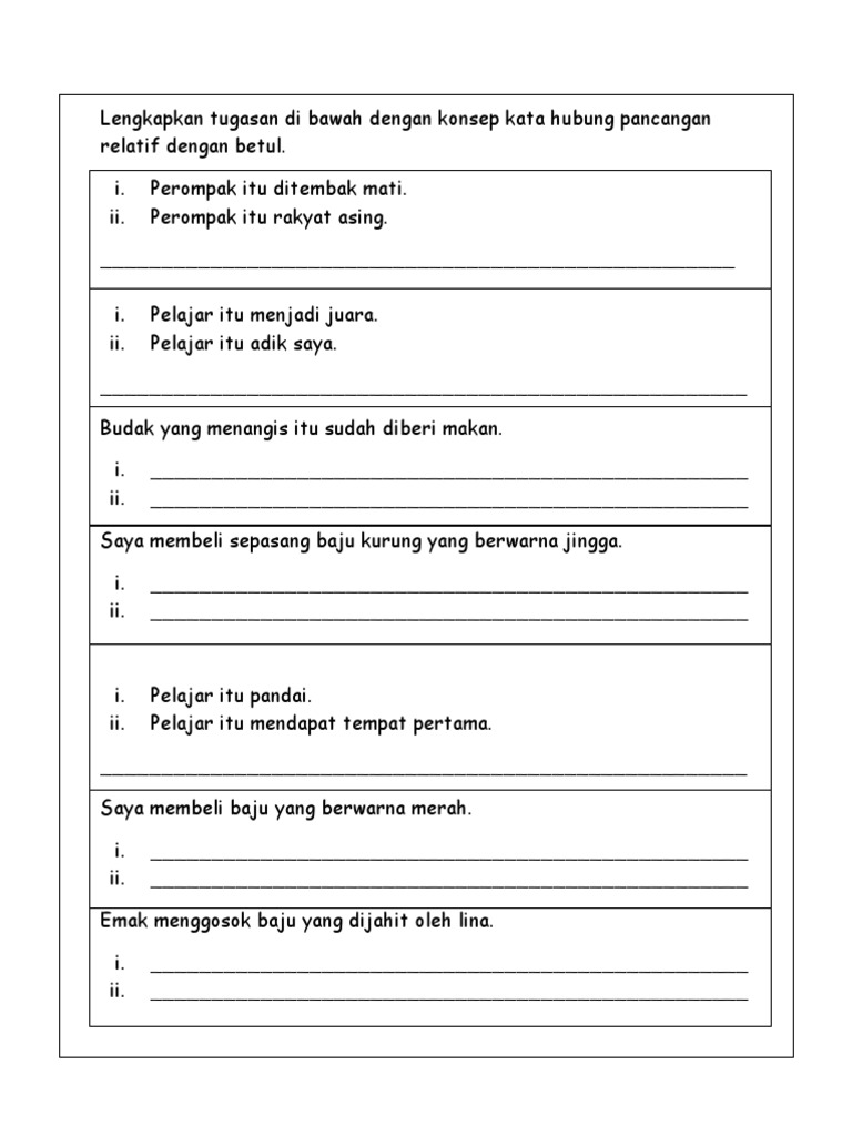 Lengkapkan Tugasan Di Bawah Dengan Konsep Kata Hubung Pancangan Relatif Dengan Betul