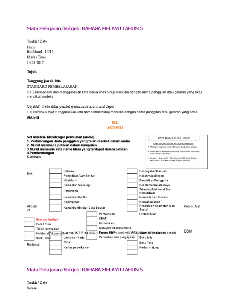 Rancangan Pengajaran Harian Rph Kurikulum Standard Sekolah Rendah Kssr Bahasa Melayu Malaysia Bm Tahun 2 Aspek Tatabahasa Golongan Kata Kata Nama Am Hidup Manusia