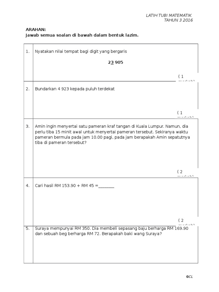 Latihan Matematik Tahun 3 2016