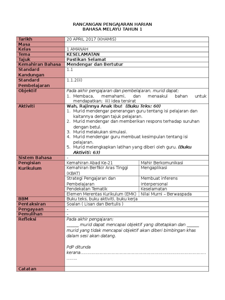 Doc Rancangan Pengajaran Harian Bahasa Melayu Tahun 1 Mem Mm Academia Edu