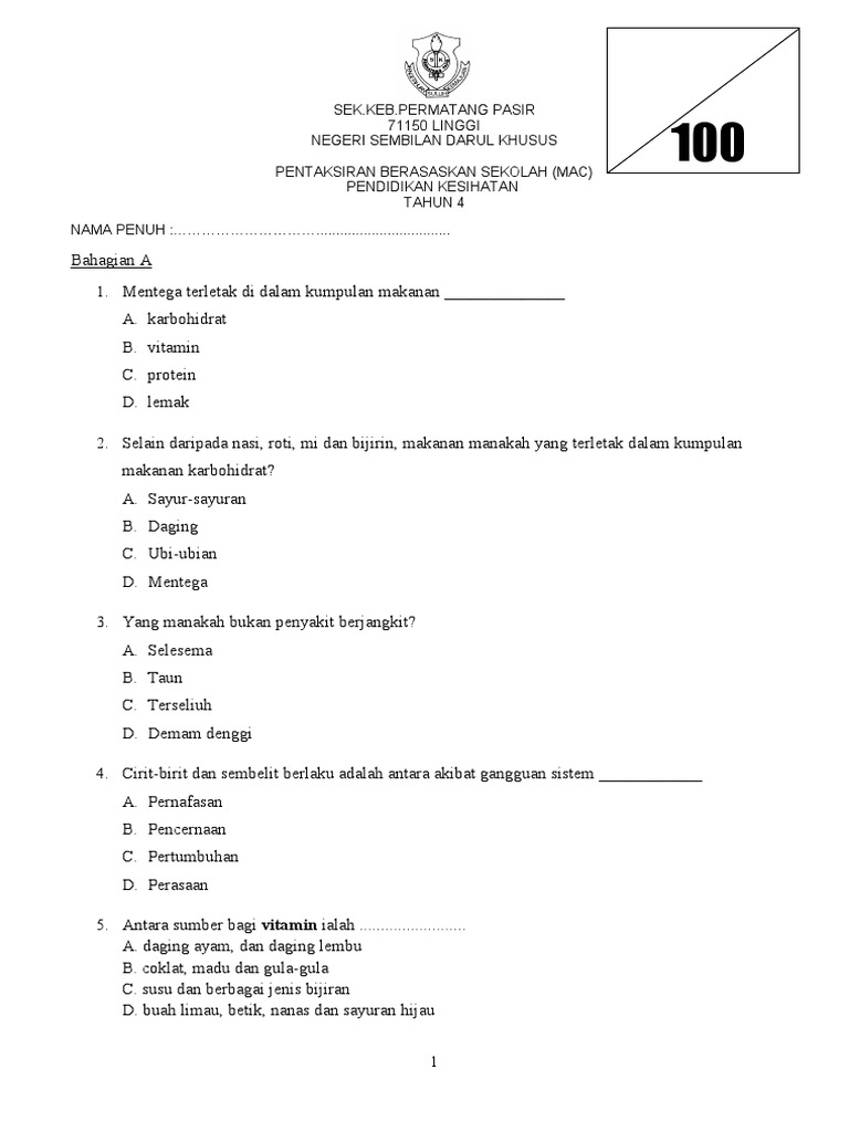 Pendidikan jasmani dan pendidikan kesihatan tahun 4. Berikut merupakan koleksi ujian pertengahan penggal 2 pendidikan kesihatan tahun 4 kssr sekolah rendah. 4 hingga 10 hari 3. Remaja lelaki akan mencapai akil baligh apabila.