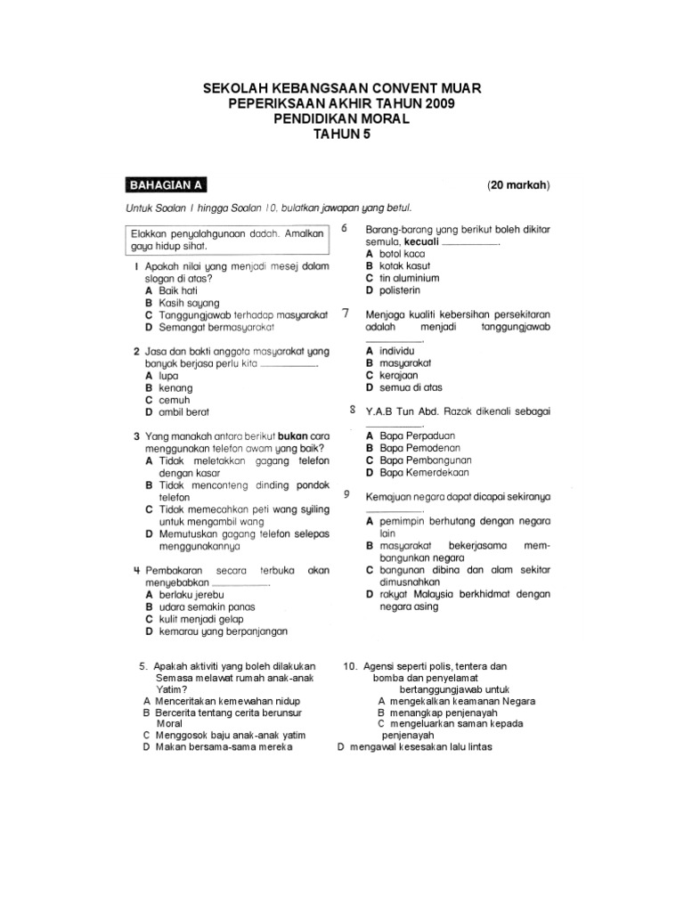 Kertas Soalan Pendidikan Moral Tahun 5 Kssr