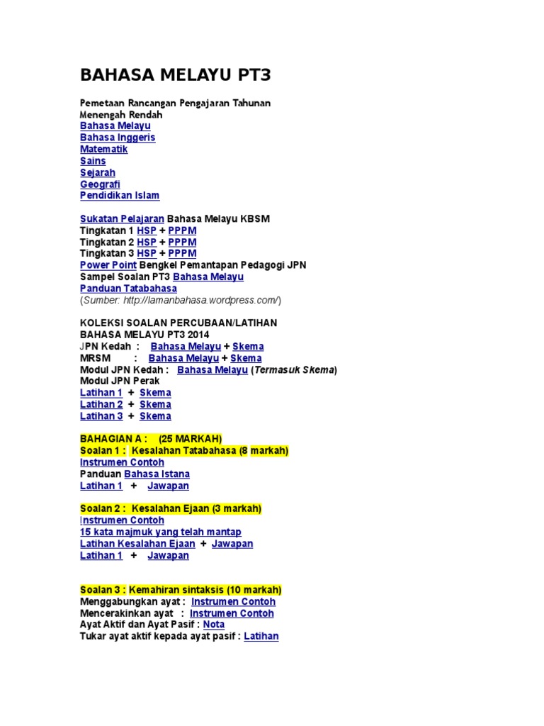Latihan pt3 bahasa melayu. Modul peningkatan prestasi pt3 2014 mpsm kedah bahasa melayu bahasa inggeris bahasa arab bahasa cina matematik sains geografi sejarah kemahiran hidup bersepadu kt kemahiran hidup bersepadu ert kemahiran hidup bersepadu spn kemahiran hidup bersepadu pdg modul latihan pt3 2014 jabatan pendidikan negeri perak bahasa melayu latihan 1 skema. Soalan pt3 geografi latihan 1 soalan pt3 geografi latihan 2 matematik. Garis kesalahan bahasa tersebut dan tulis jawapan yang betul pada ruang jawapan yang disediakan. Modul latihan bahasa melayu pt3 pt3 t3.