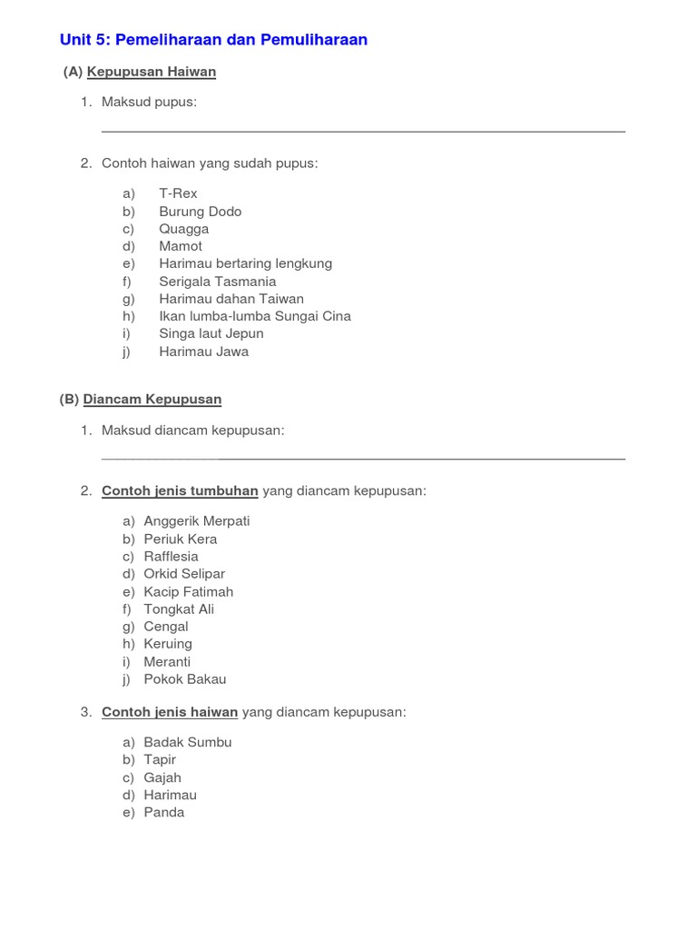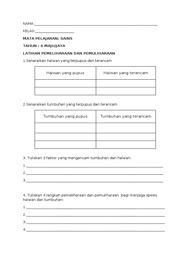 Latihan Sains Tahun 6 Pemeliharaan Dan Pemuliharaan