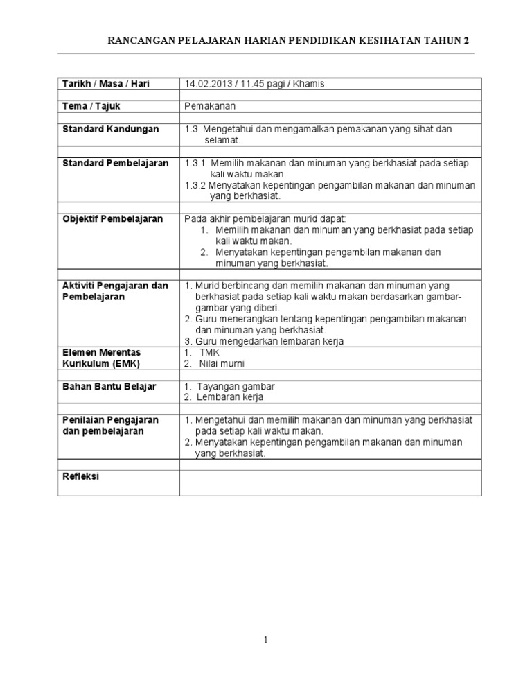 Doc 68267525 Rancangan Pengajaran Harian Pendidikan Kesihatan Tahun 4 1 Tzesoon Chean Academia Edu