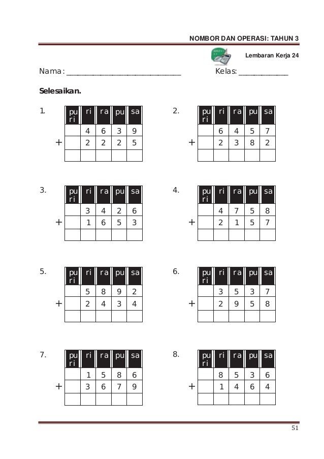 Sudut Matematik Lembaran Kerja 3 Operasi Tambah