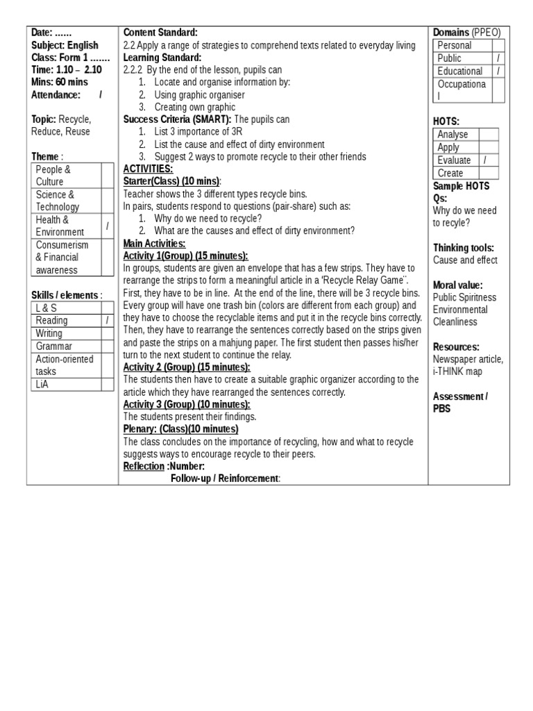Lesson Plan For The Teaching Of English For Form 1 Studen Ota Tech