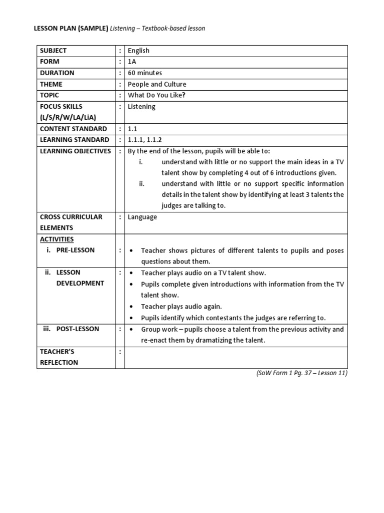 Sample Lessons Plan English Cefr Form 1 And Form 2 Lesson Plan Teachers