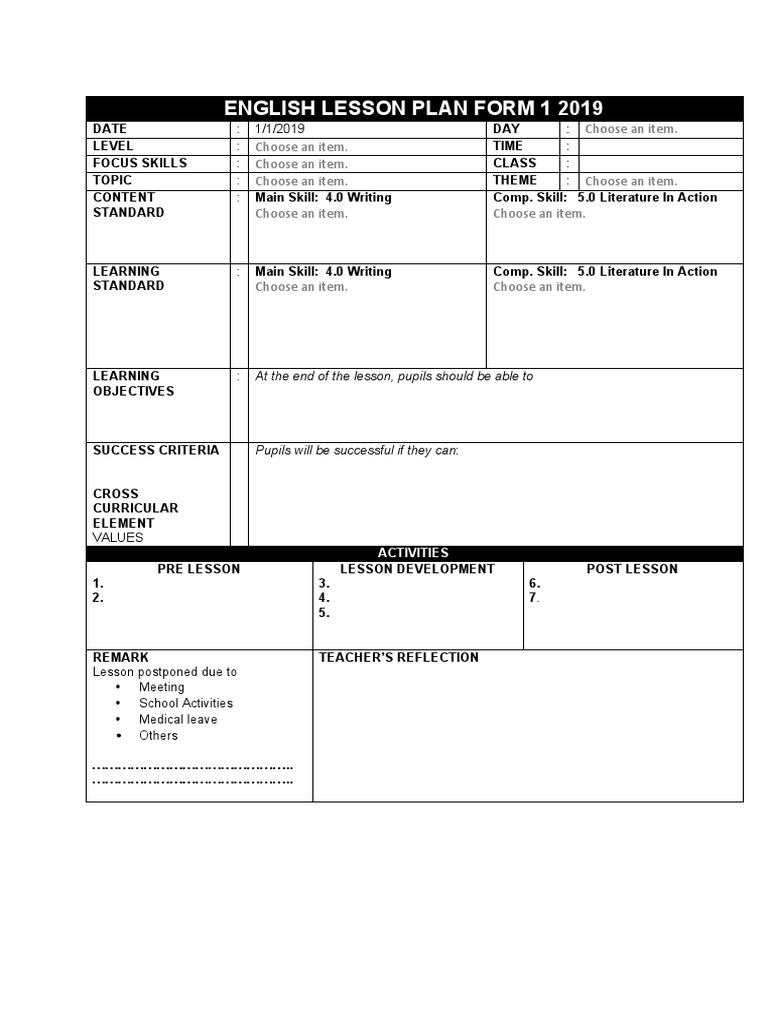 Lesson Plan Form 1 English Lesson Plan Educational Psychology
