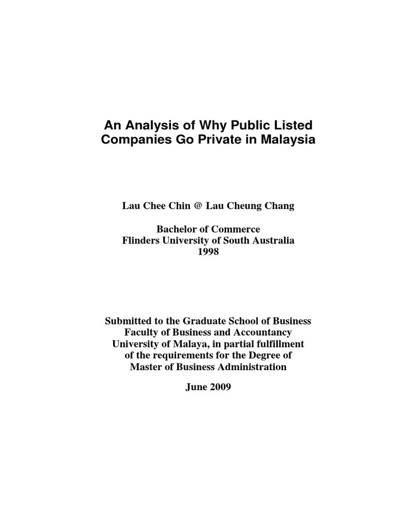 Lau Cheung Chang An Analysis Of Why Public Listed Companies Go Private In Malaysia Mba Thesis Sarbanes Oxley Act Stocks